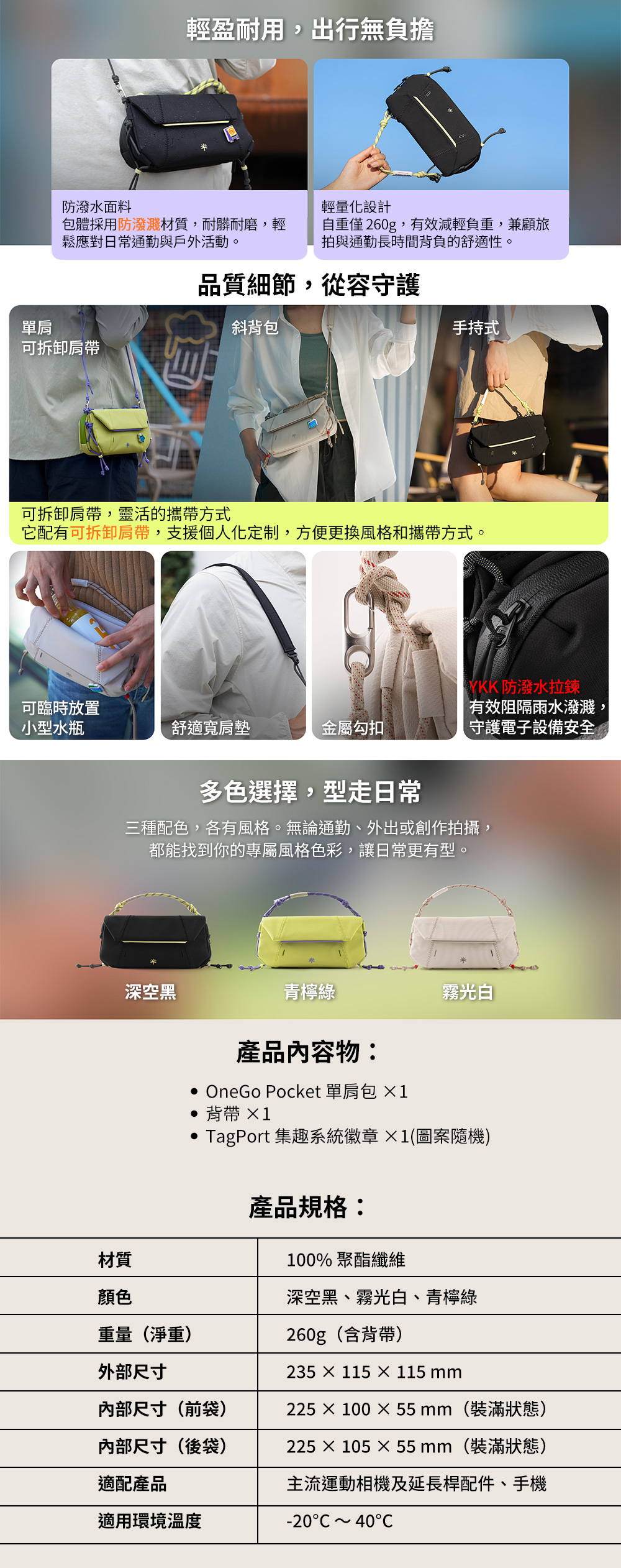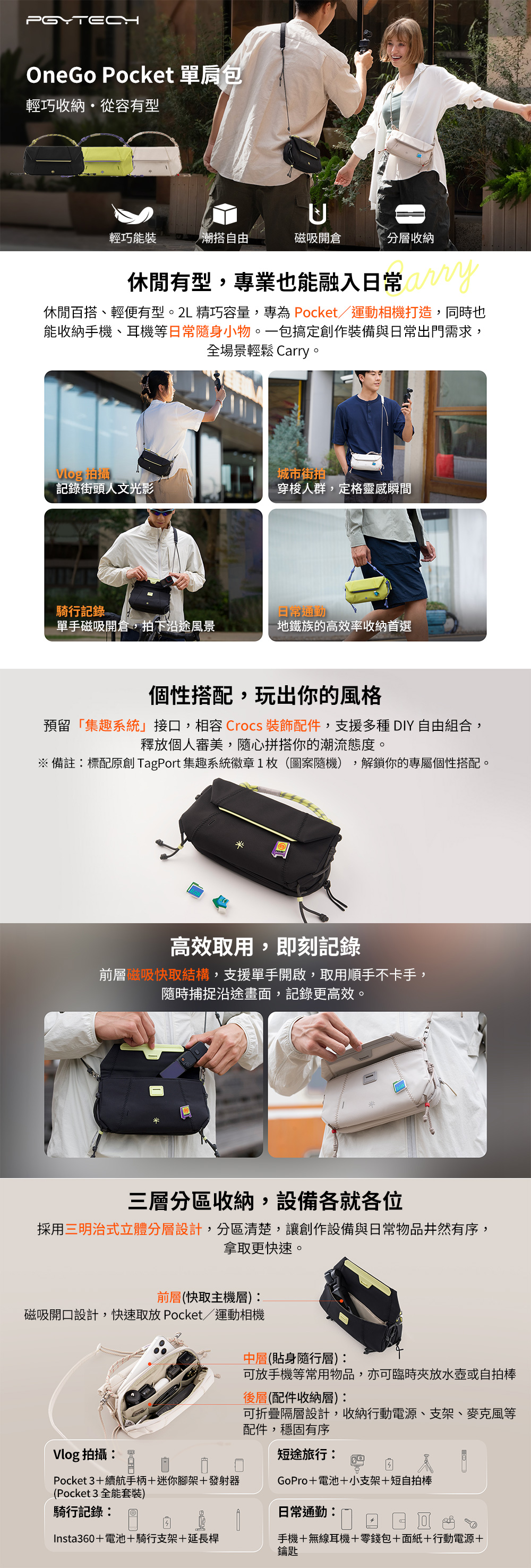 多場景收納設計:相容 Pocket 相機、運動相機、手機與日常隨身物品,一包搞定通勤與旅行需求。